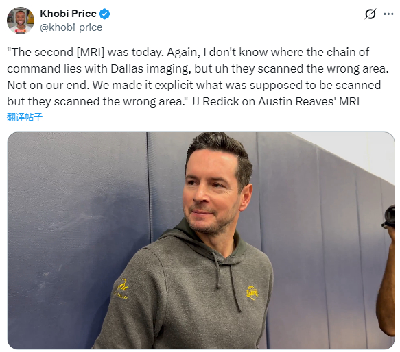 湖人主教练雷迪克透露里夫斯在达拉斯接受检查时被扫错了部位,他表示:里夫斯第二次MRI检查是在今天进行的。再次声明,我搞不清楚达拉斯影像中心那边的层级管理究竟是如何运作的,但他们(第一次)扫错了部位。不是我们的错,我们已经非常明确地指出了应当扫描的具体部位,但他们还是扫错了地方。